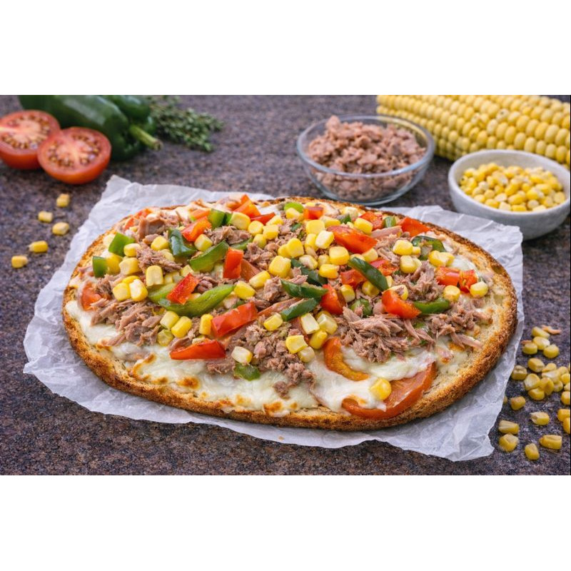 Toasted bread, sliced tomato, mozzarella, tuna, peppers, corn