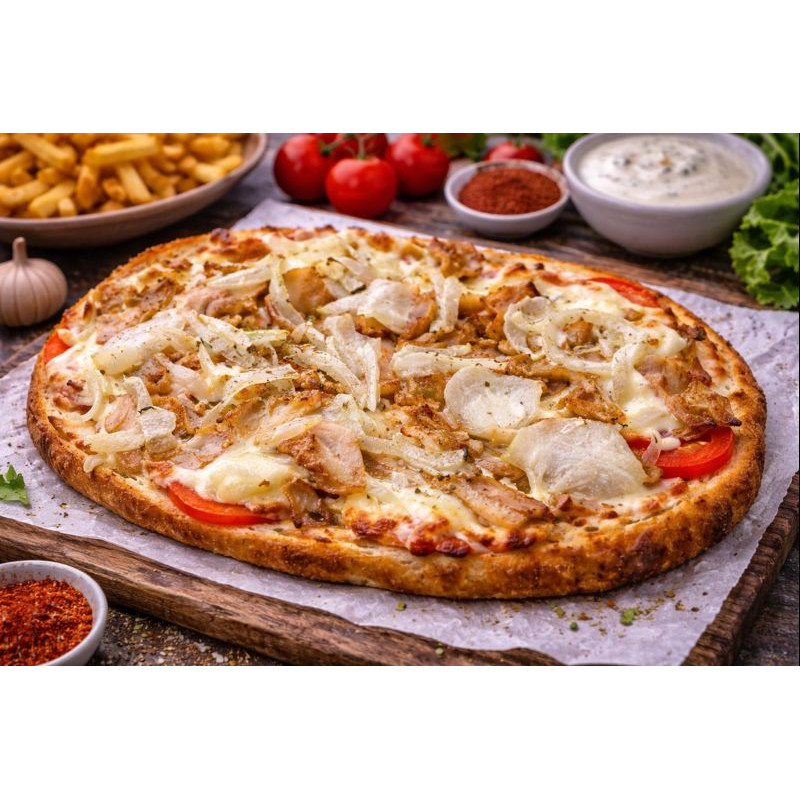 Toasted bread, sliced tomato, mozzarella, Kebab strips , onions
