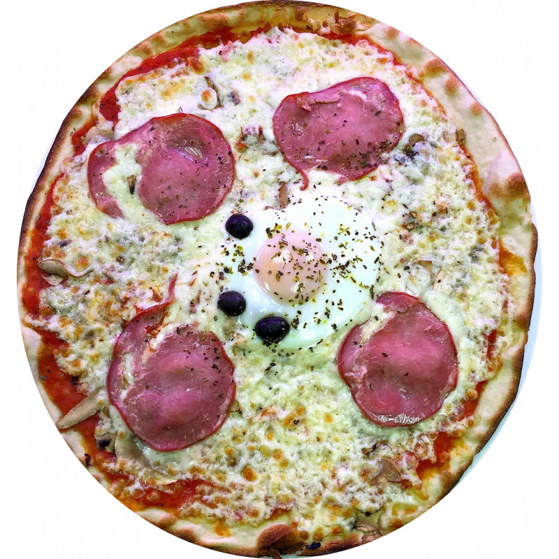 Tomato, mozzarella, egg, bacon, mushrooms, olives, oregano