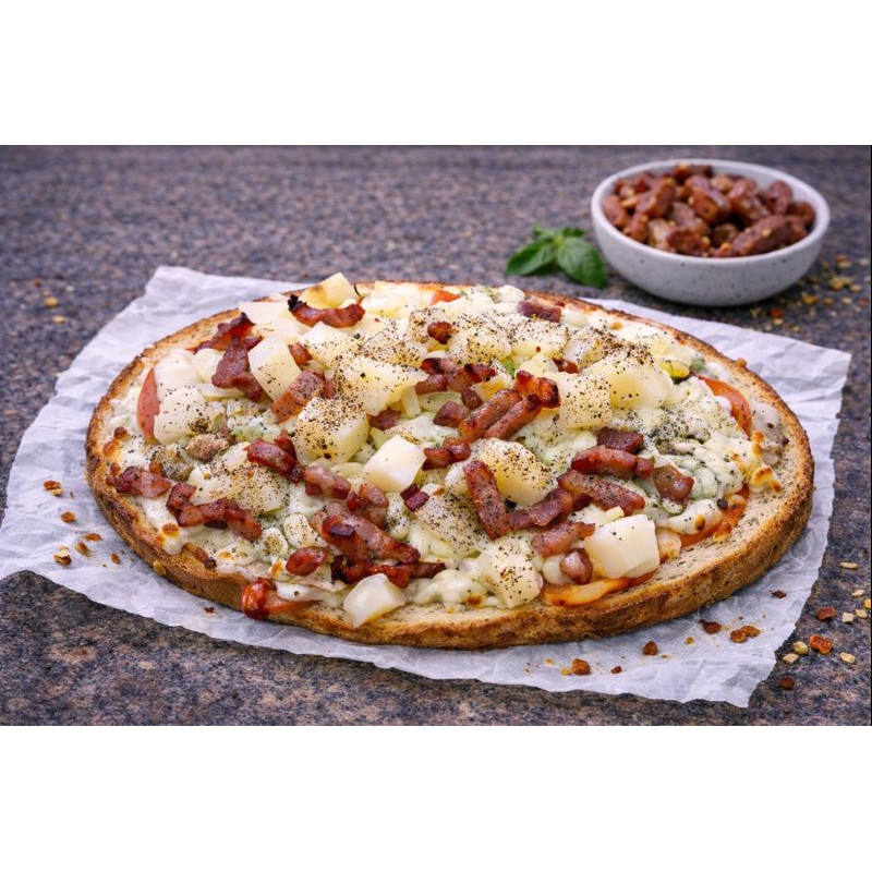 Tomates en rondelles , mozzarella , lardons ,pommes de terre , champignons , oignons , poivre
