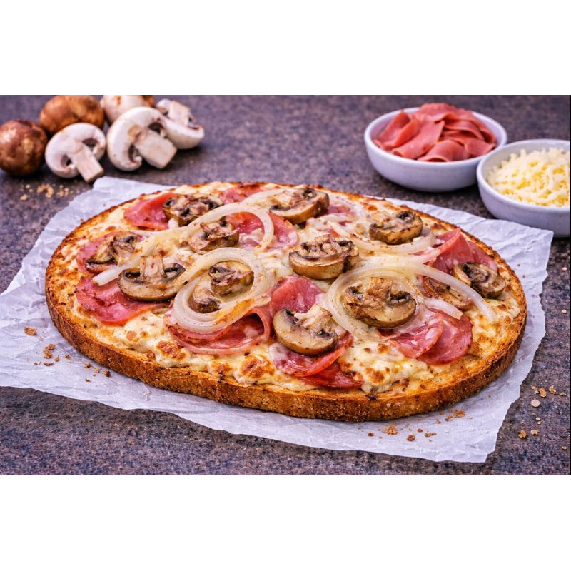 Tomates en rondelles , mozzarella , jambon , champignons , oignons