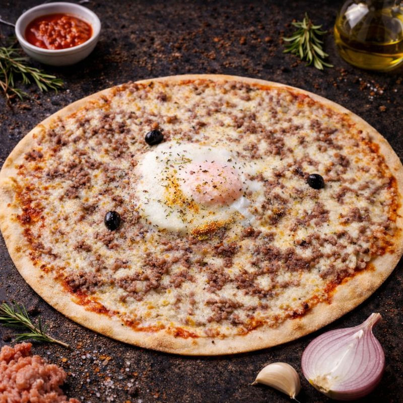Tomate , mozzarella , viande hachée 100% pur boeuf , oignons , oeuf , parmesan , olives , origan