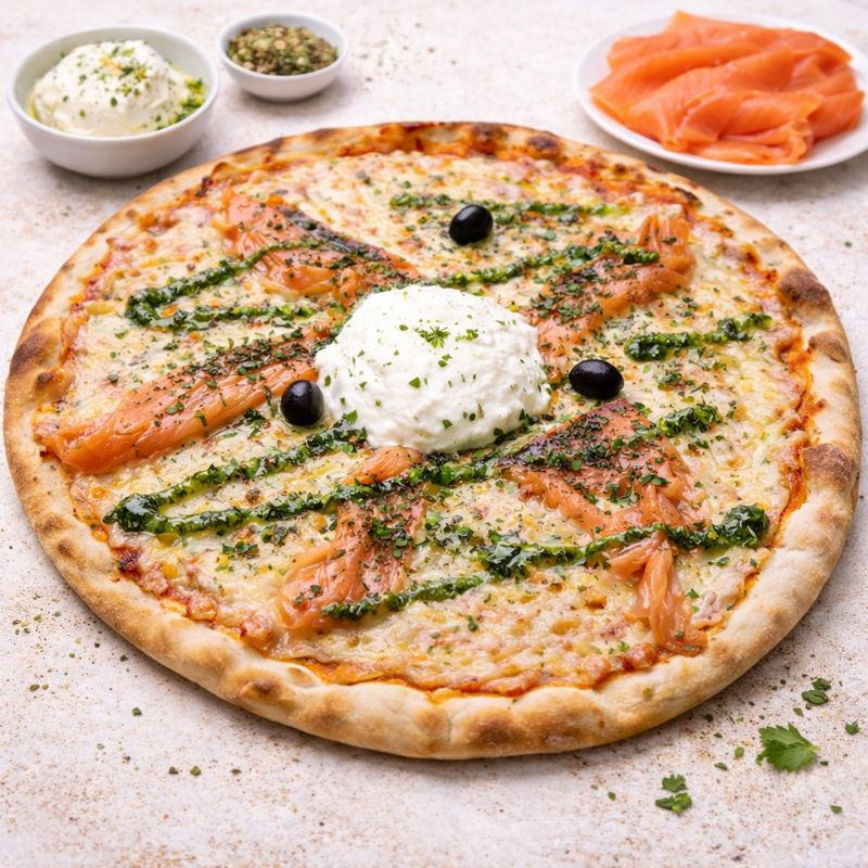 Tomate , Mozzarella , saumon fumé , crème fraîche , basilic , olives