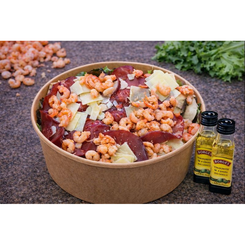 Salade , tomate , champignons , Bresaola , parmesan , crevettes , huile d'olive