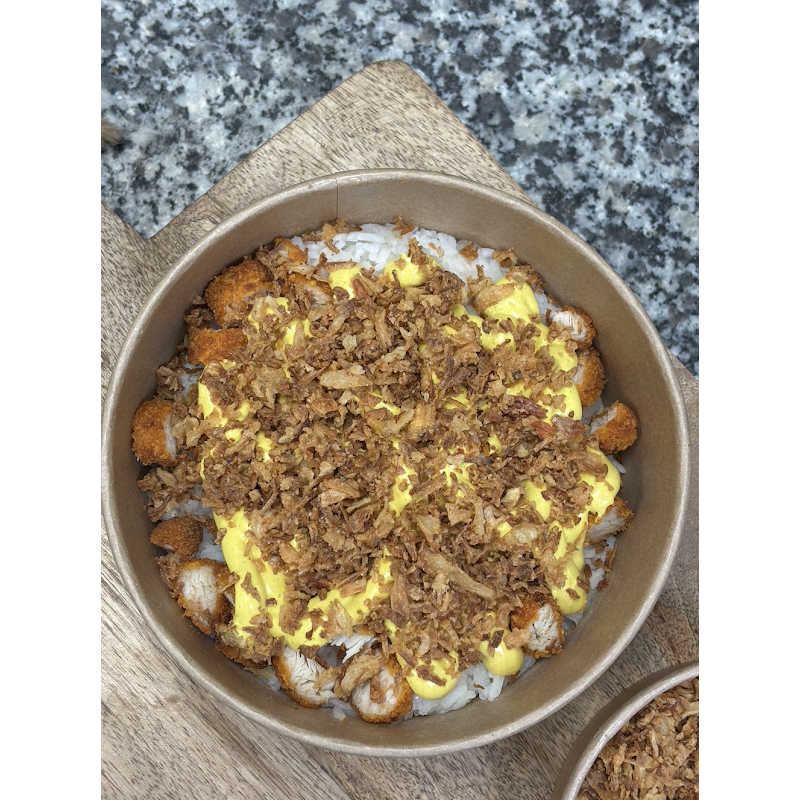 Riz blanc Thaï , chaud recouvert de morceaux de Chicken tenders avec une sauce au choix et des oignons grillés croustillants .
