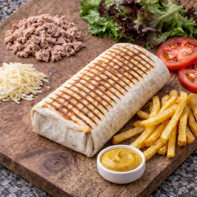 Galette de blé roulée garnie de salade , tomate , fromage , thon, frites , SAUCE CURRY
