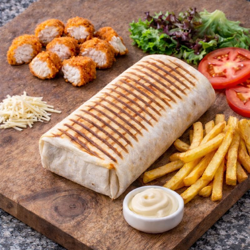 Galette de blé roulée garnie de salade , tomate , fromage , filets de poulet panés , frites , Mayonnaise
